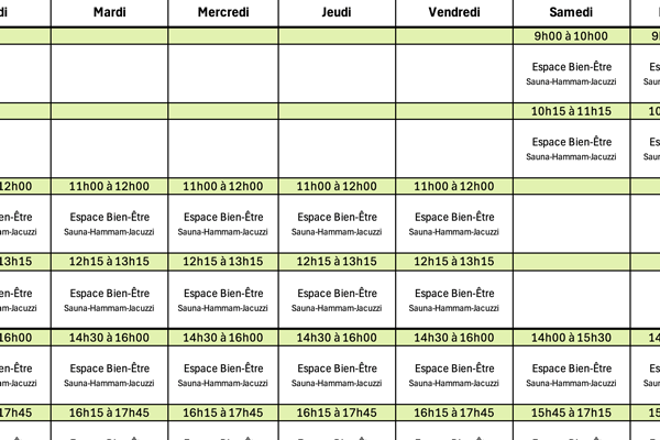 Planning des activités aquatiques Planning des activités en salle Lundi Mardi Mercredi Jeudi Vendredi Samedi 9h - 9h45 Pilates 10h -10h45 Stretching 11h -11h45 Body-sculpt 12h30 - 13h15 12h30 - 13h15 12h30 - 13h15... Planning espace bien-être